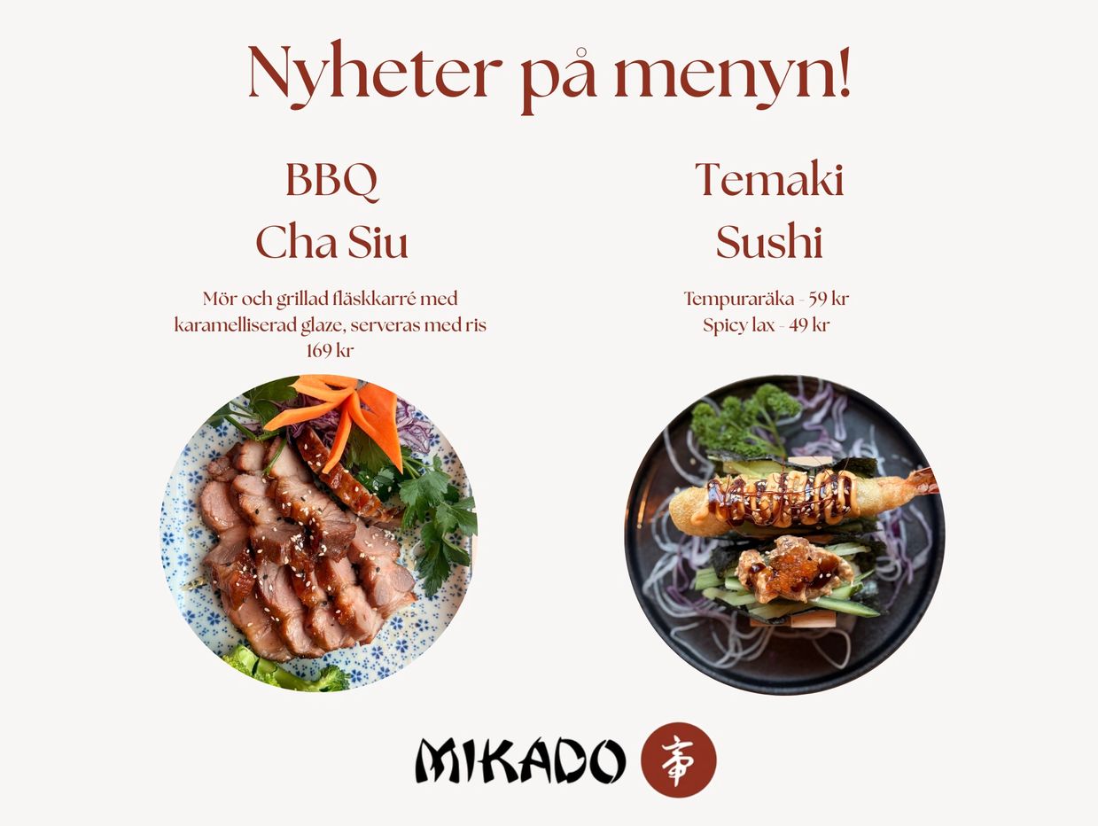 Välkommen till oss på Mikado där tradition och kreativitet möts for att ge dig en unik japansk matupplevelse i hjärtat av Göteborg. Som den första japanska restaurangen i staden har vi blivit en uppskattad del av mat scenen, och vi är stolta att kunna servera genuin japansk mat som Teppanyaki, Sukiyaki, Kaiseki meny, Sushi och mycket annat. Vi är lägger mycket omsorg i att välja de bästa och färskaste råvarorna för vår meny.